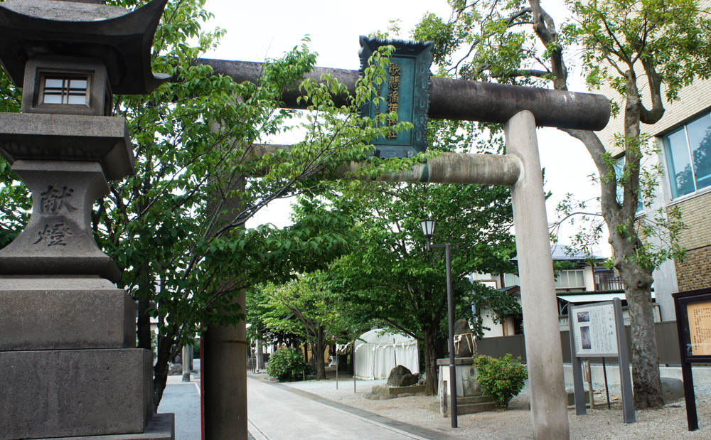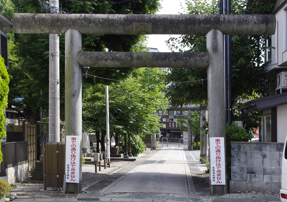 かつては山形城三の丸の十日町口に面していました。現在の鳥居は明治時代に建立されました。