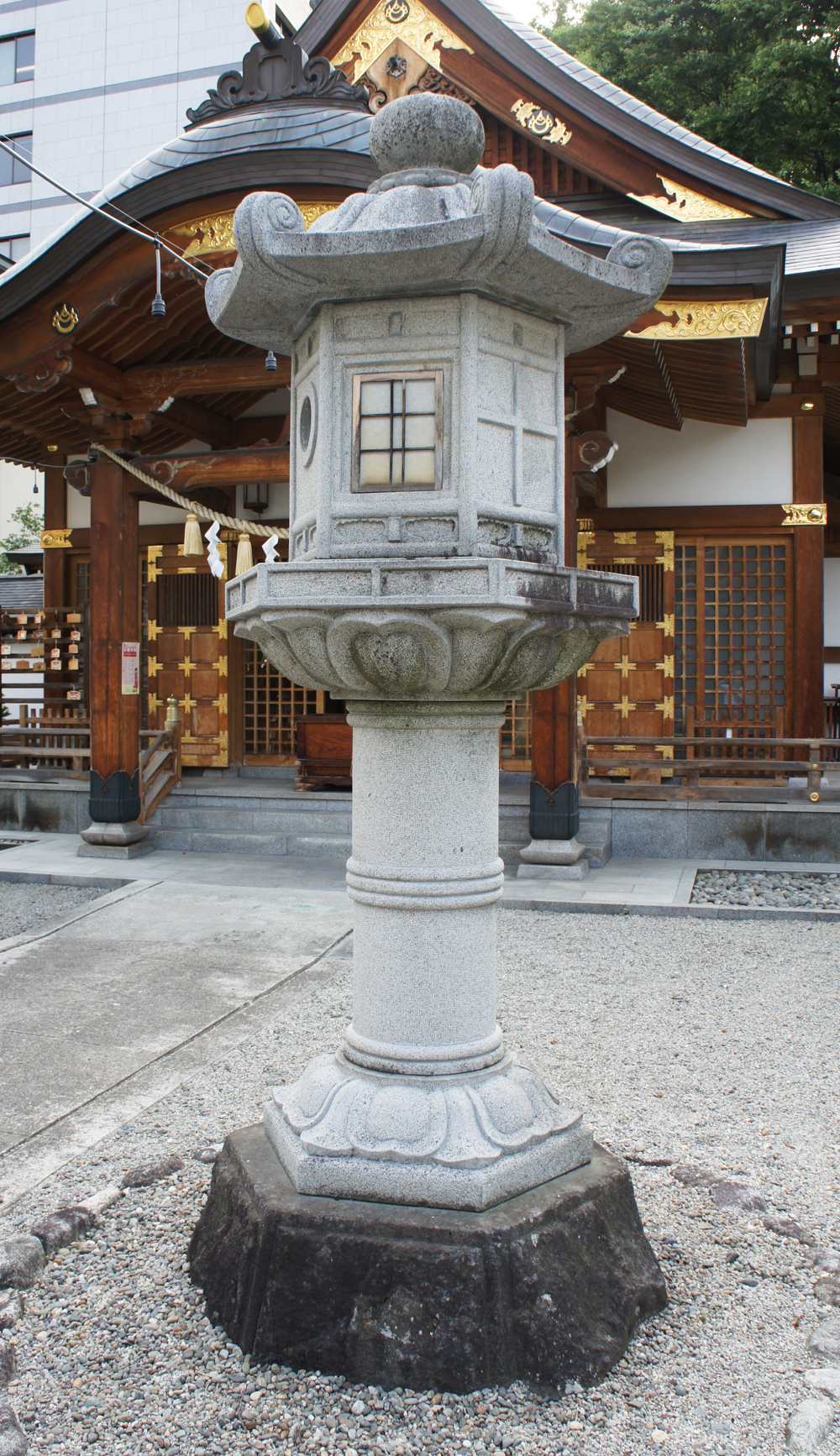 もとは一対の金灯篭でしたが、戦時中の金属供出により長らく台座のみとなっておりました。平成10年に氏子によって台座の上に石灯籠が寄進され、現在の姿になっております。